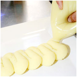 5- Coloque o purê em um saco plástico, corte uma das pontas, e distribua-o no prato.