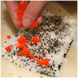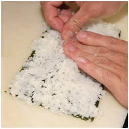 1- Sobre a folha de nori, distribua o arroz, cobrindo-a.